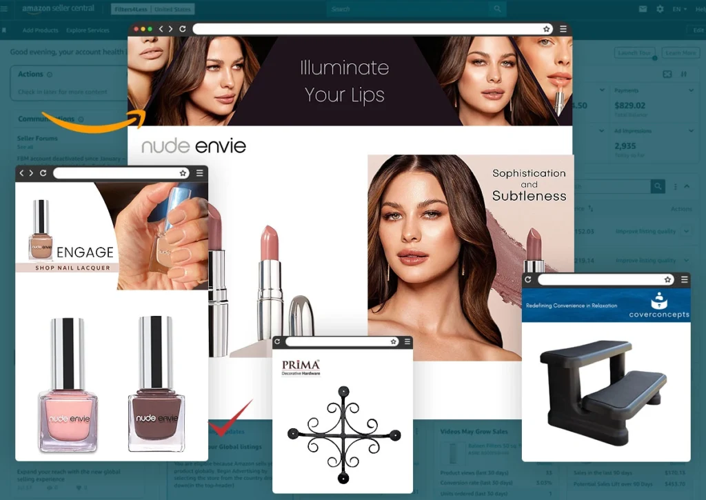 A+ Content, Brand Stores, and Sponsored Brands that enhance product storytelling and conversion rates.
