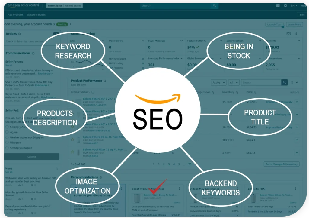 Amazon SEO is the process of optimizing product listings to improve their visibility and ranking in Amazon’s search results. It involves using relevant keywords, high-quality images, and engaging content to attract potential customers and appeal to Amazonโs A10 algorithm.ย
